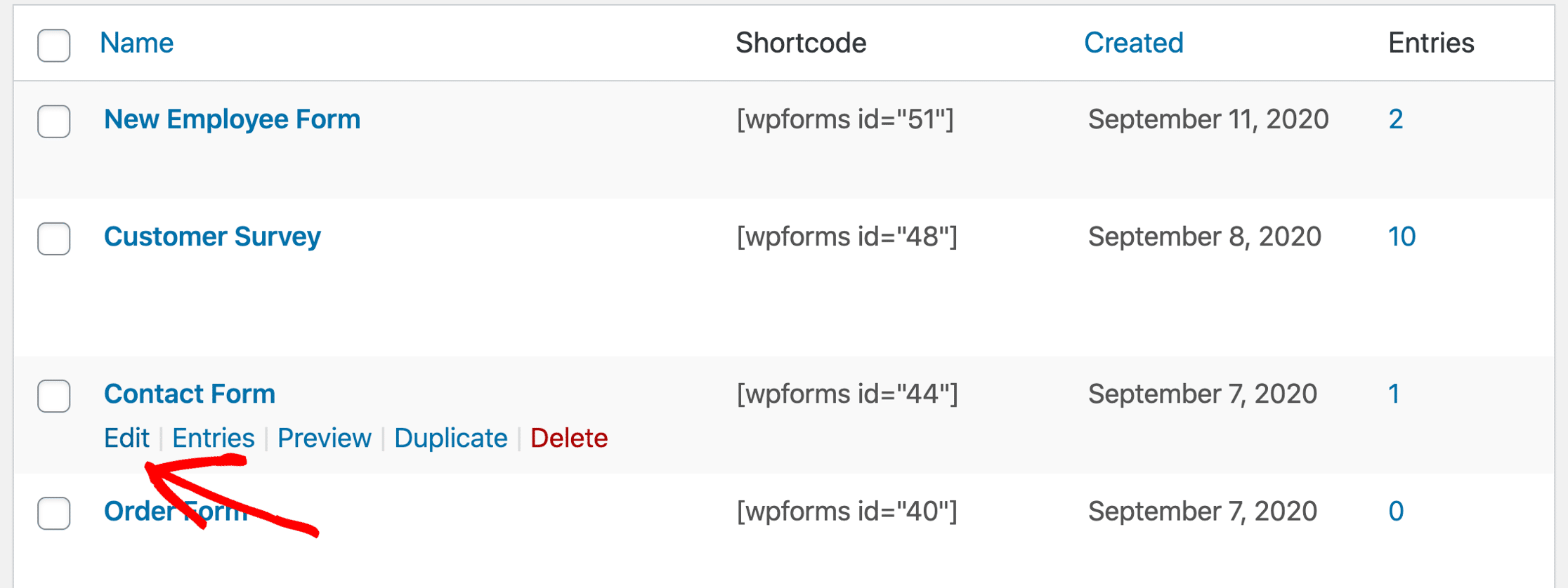 En WPForms, busque el formulario al que desea agregar una denylist. Luego haga clic en Editar debajo del nombre del formulario.