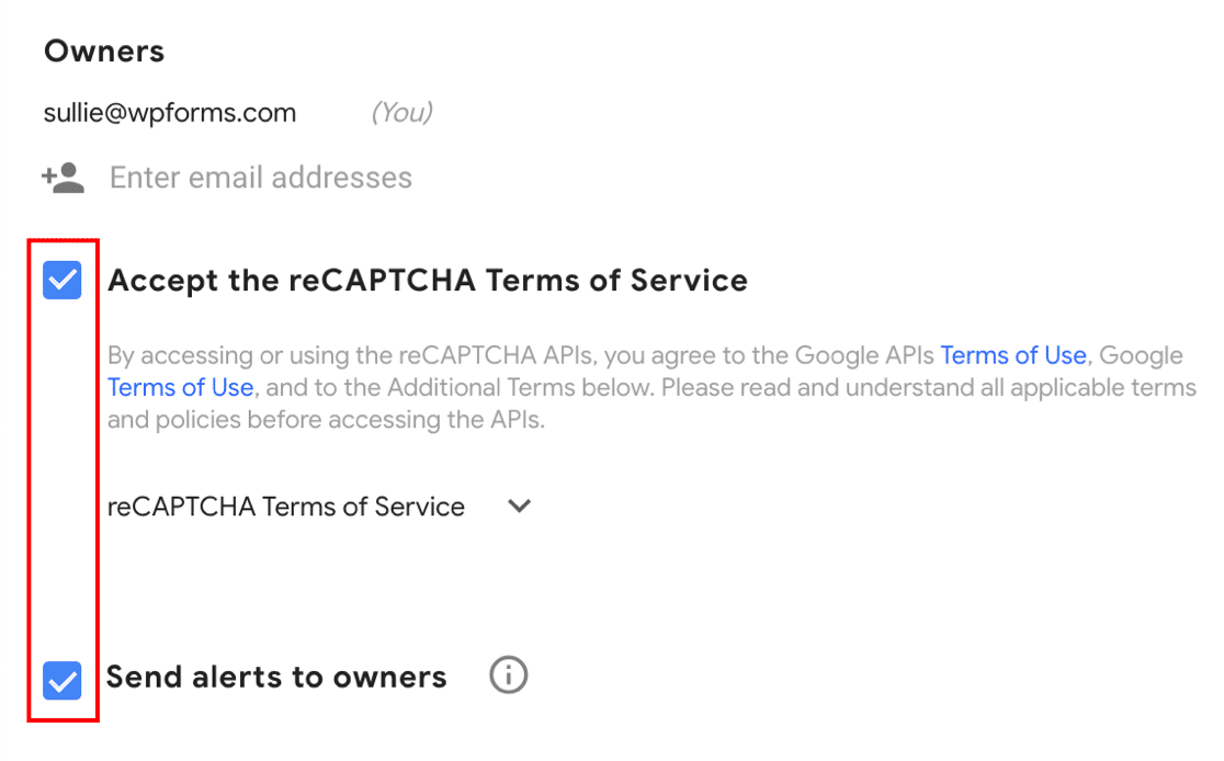En este ejemplo, usaremos el método Checkbox para mostrarle cómo funciona la configuración del formulario. Si elige un tipo de reCAPTCHA diferente, algunas de las capturas de pantalla de este punto pueden verse ligeramente diferentes.