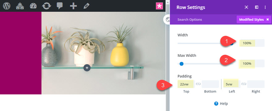 Necesitamos hacer algo de espacio para el texto que se agregará, así que continúe y haga que la fila sea de ancho completo abriendo la configuración de la fila y actualizando lo siguiente: