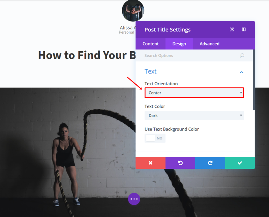 Abra el primer Módulo de texto y cambie la Orientación del texto a 'Centro' en la subcategoría Texto de la pestaña Diseño.