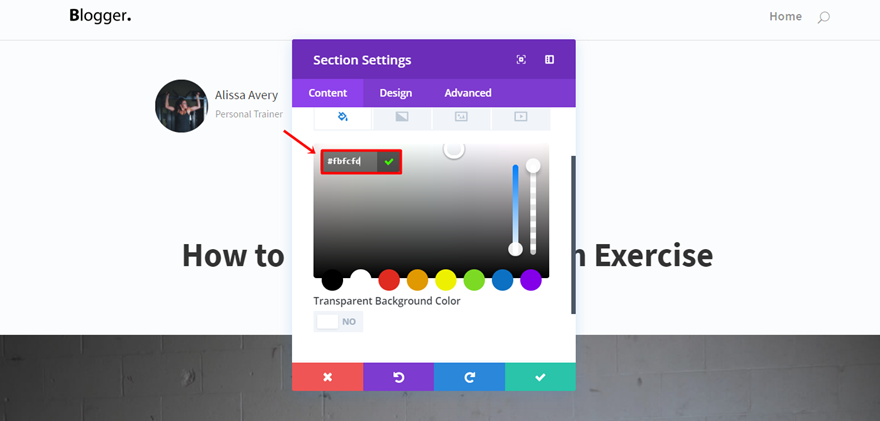 Para hacer el diseño, cambiaremos al Visual Builder. Comience agregando una nueva sección con dos filas. Continúe agregando un módulo de imagen a la primera columna y dos módulos de texto a la segunda columna. Abra la configuración de la sección y agregue, elija '#fbfcfd' como su color de fondo.