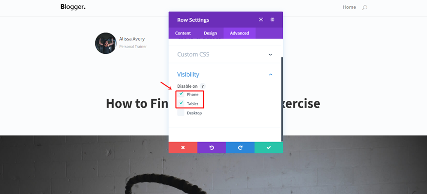 Finalmente, abra la configuración de Fila y desactive la fila en teléfonos y tabletas en la subcategoría Visibilidad de la pestaña Avanzado.