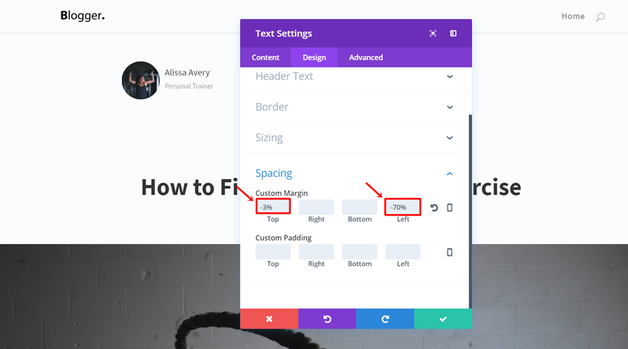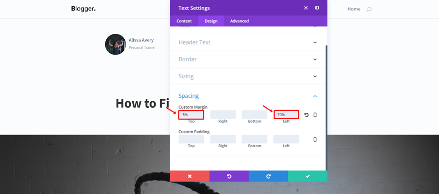Además, desplácese hacia abajo en la misma pestaña y agregue '-5%' al Margen superior y '-70%' al Margen izquierdo en la subcategoría Espaciado.