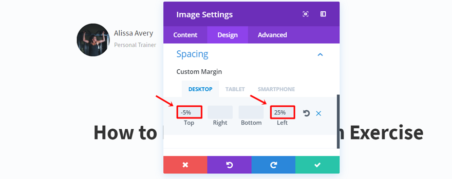Abra el Módulo de imagen, cargue la imagen en la pestaña Contenido y coloque la Alineación de imagen en 'Izquierda' en la pestaña Diseño. Continuando, agregue '-5%' al Margen superior y '25% 'al margen izquierdo en la subcategoría Espaciado de la pestaña Diseño.