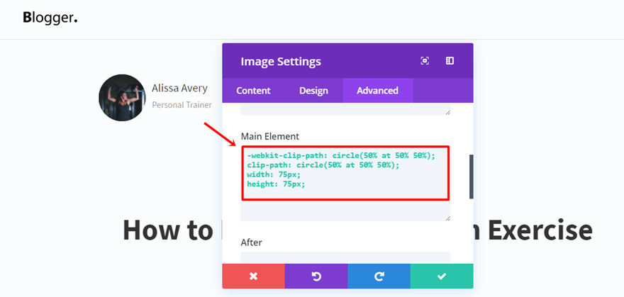 Después de eso, agregue el siguiente código al elemento principal en la subcategoría CSS personalizado de la pestaña Avanzado: