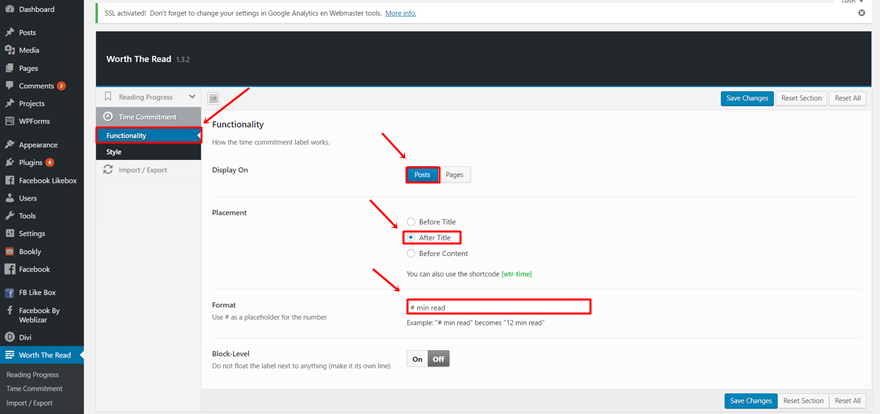 Una vez que haya descargado el complemento y lo haya activado, haga clic en la opción 'Progreso de lectura' en su menú. Continúe y realice los cambios necesarios. Poner un tiempo de lectura generalmente solo se usa para publicaciones, por lo que la mayoría de las personas probablemente elegirán solo esa opción.