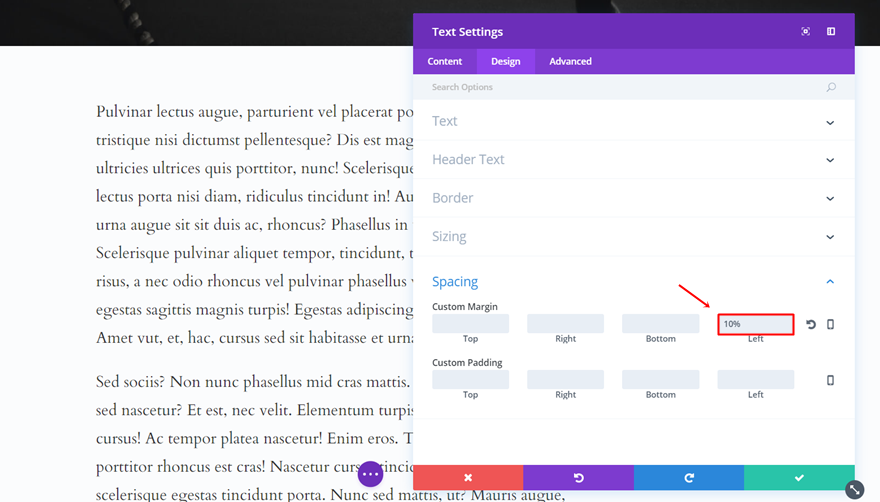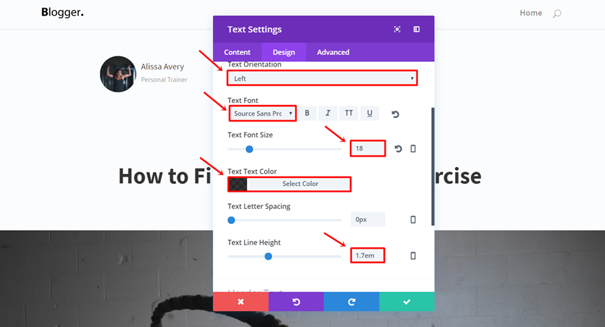 Además, abra la configuración del módulo Texto, escriba un texto de muestra en el cuadro Contenido y vaya a la pestaña Diseño. Dentro de la subcategoría Texto, realice los siguientes ajustes: