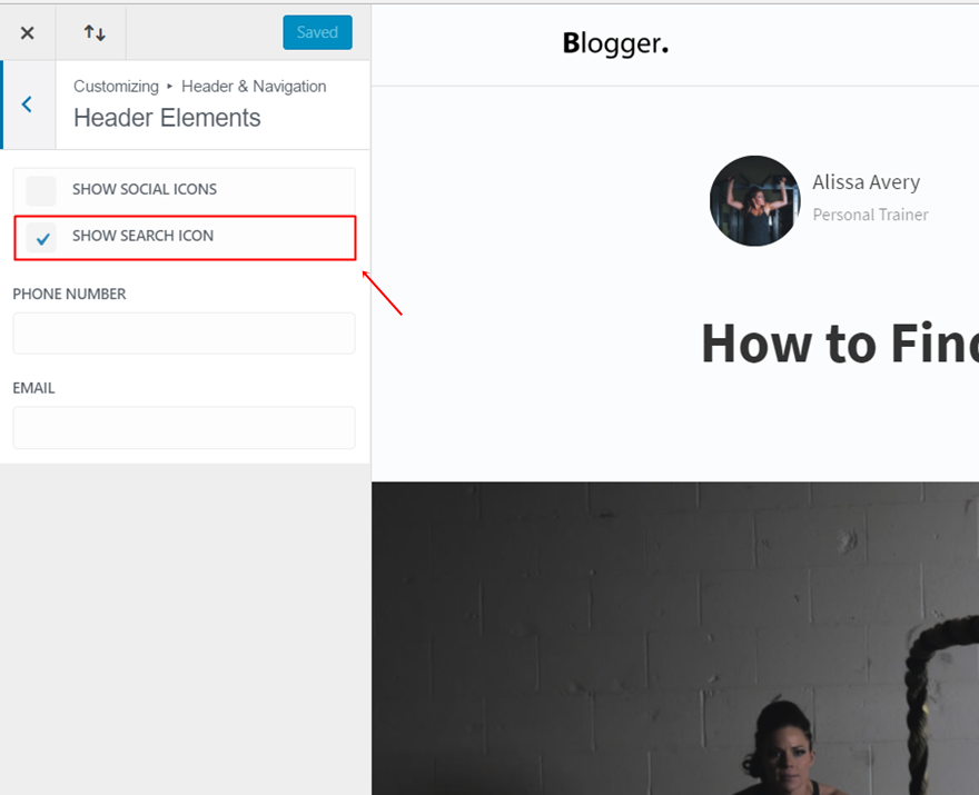 Además, para incluir el icono de búsqueda en su menú principal, vaya a Encabezado y navegación> Elementos del encabezado> Mostrar icono de búsqueda.