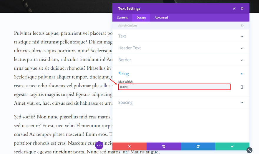 Desplácese hacia abajo en la misma pestaña, agregue '800px' al Ancho máximo en la subcategoría Tamaño y agregue '10% 'al Margen izquierdo en la subcategoría Espaciado.
