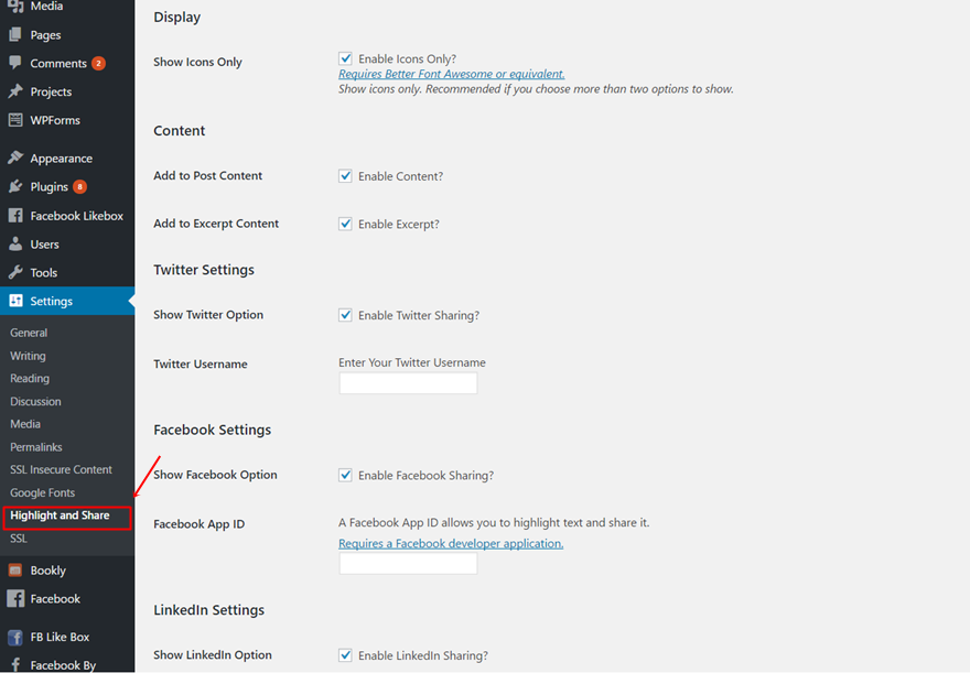 Puede decidir en qué canales de redes sociales las personas pueden compartir yendo a Configuración> Resaltar y compartir> Habilitar los canales de redes sociales que le gustaría usar.