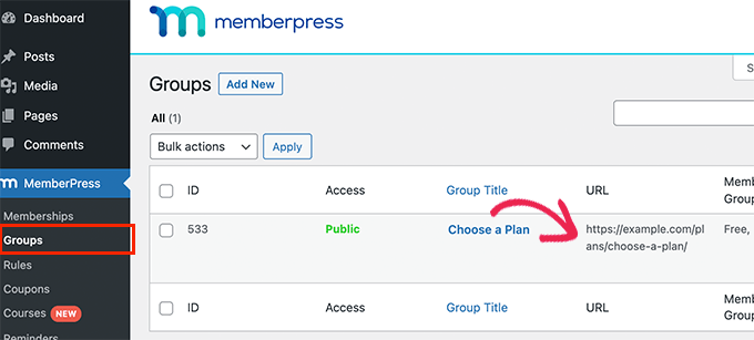 Para hacer eso, primero debe visitar la página MemberPress » Groups y copiar la URL al lado del grupo que creó anteriormente.
