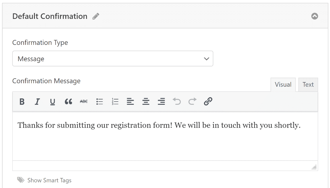 También puede utilizar la configuración Tipo de confirmación en WPForms para mostrar un mensaje, vincular a otra página o redirigir al usuario.