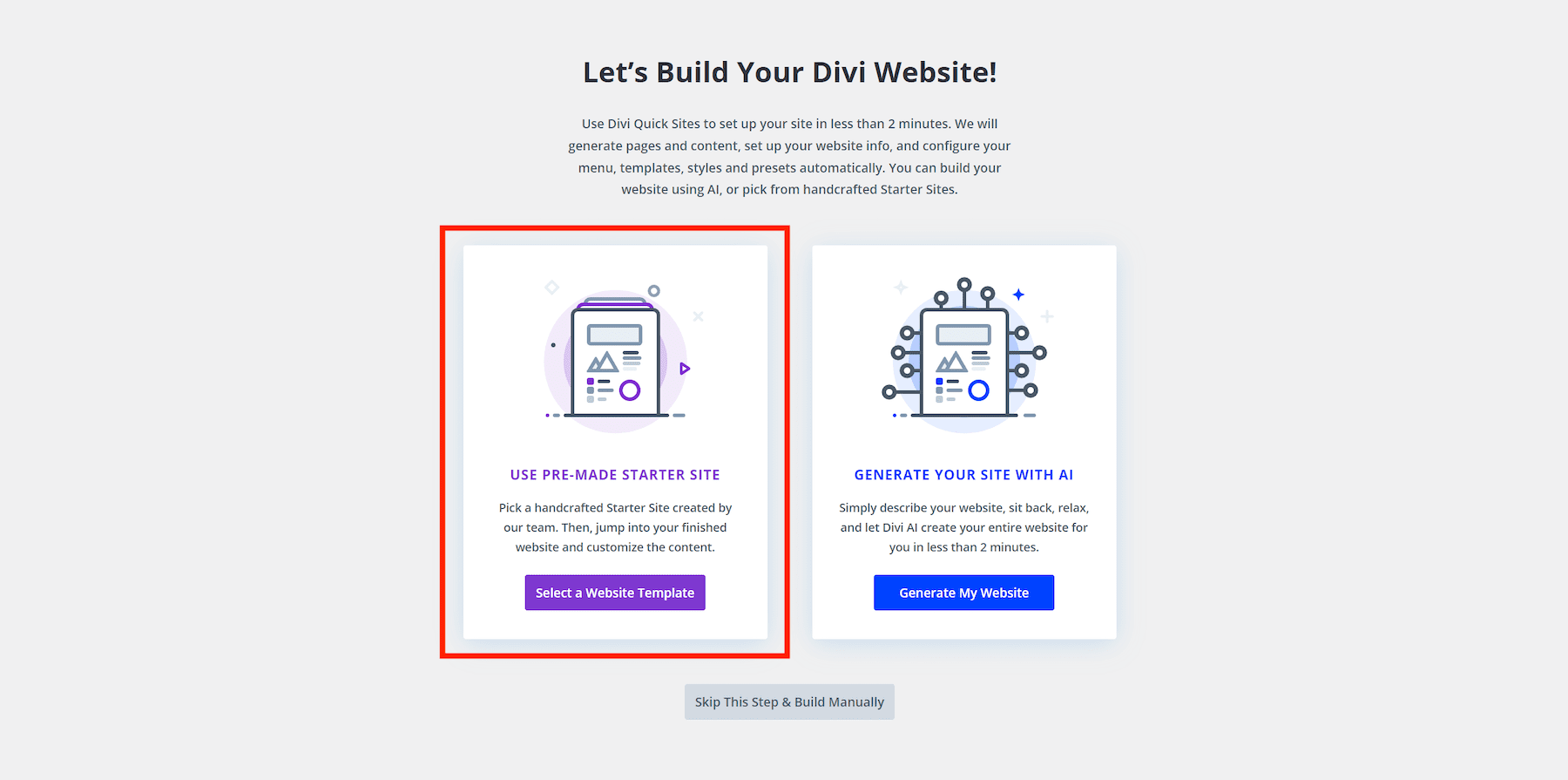 Una vez que haya instalado y activado Divi en su panel de WordPress, puede crear un sitio web de bodas completo utilizando Divi Quick Sites y Starter Sites en menos de cinco minutos.