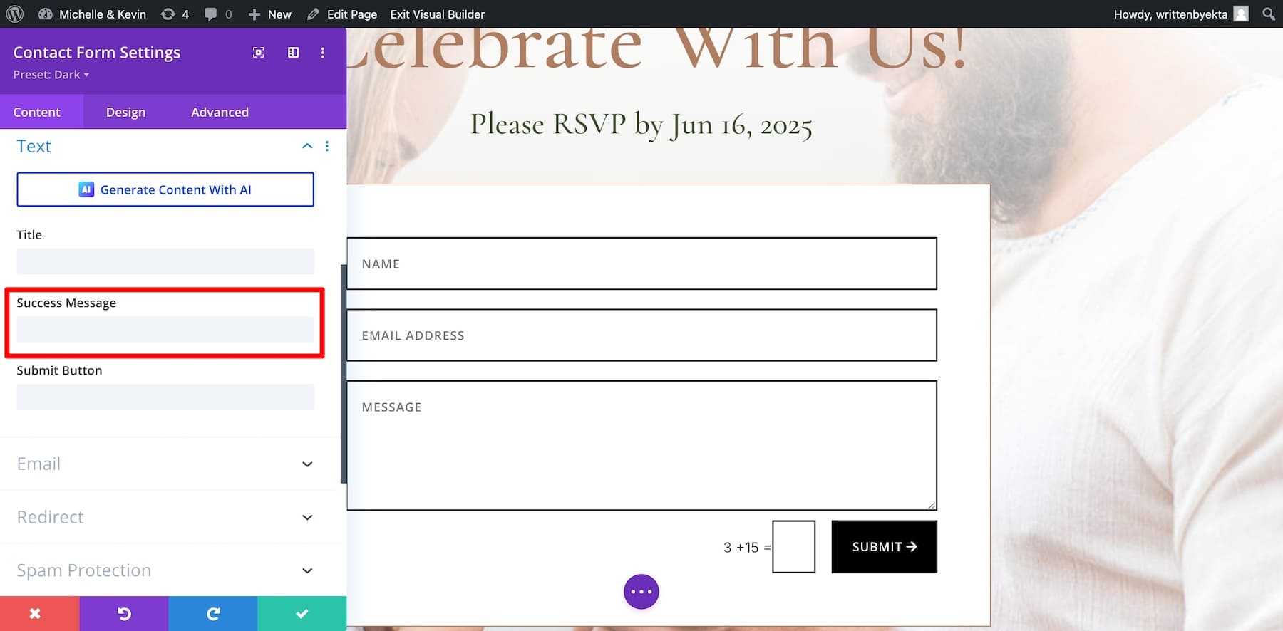 Su página de confirmación de asistencia debe estar activa para recopilar a los invitados confirmados en una lista y tener un recuento por adelantado. El tema Divi viene con un módulo de formulario de contacto Divi , que es suficiente para que su página de RSVP sea funcional, pero también puede consultar complementos avanzados de reserva de RSVP como WPForms o Divi Events Calendar.