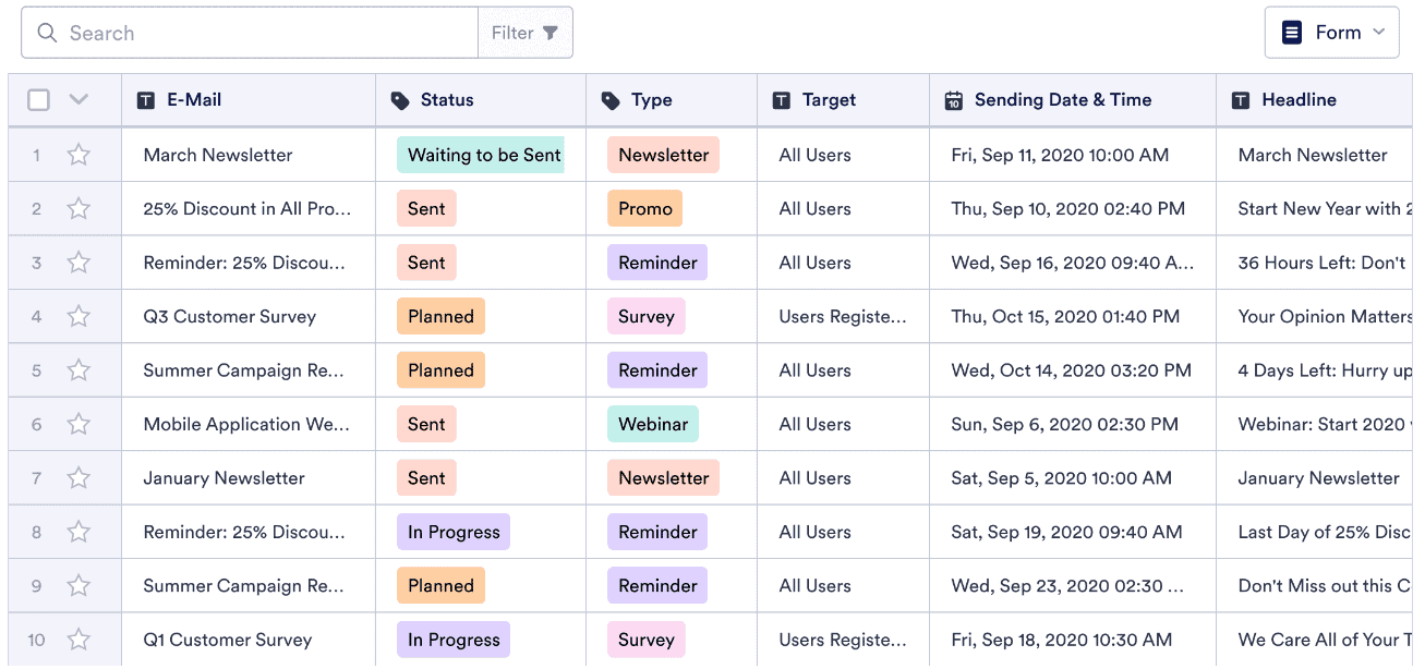 Un calendario organizado tiene todos los detalles de una campaña de correo electrónico, como el nombre de la campaña, el remitente, la lista de correo electrónico de destino, la hora de envío, las líneas de asunto, etc.