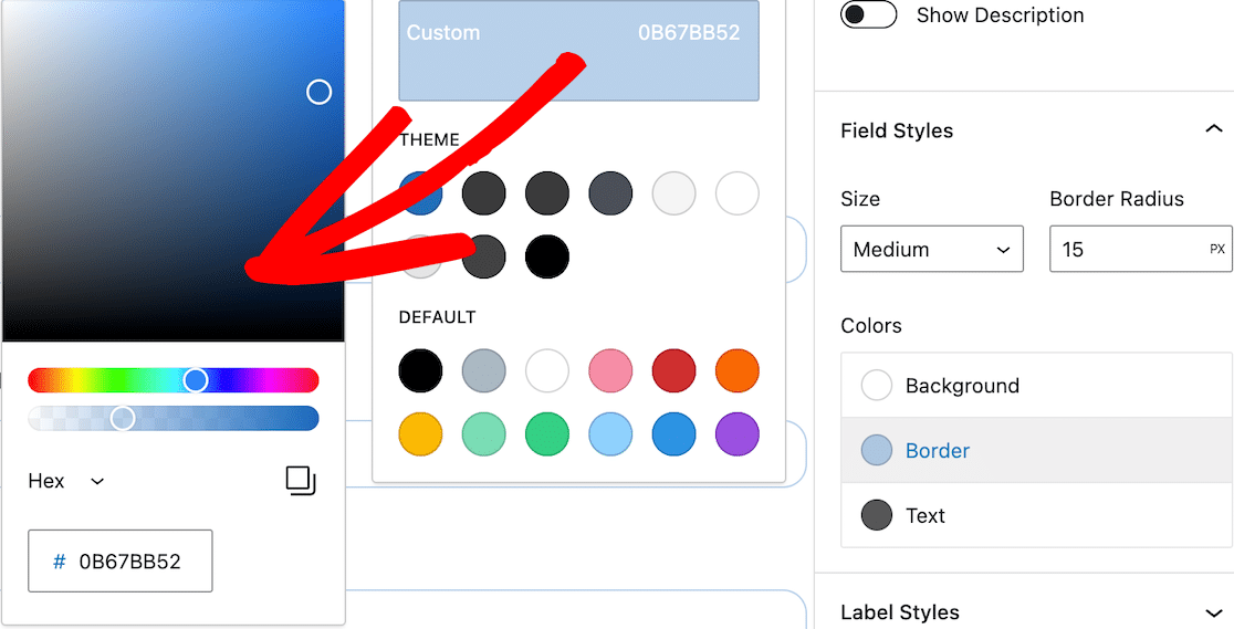 Tal como lo hizo en la sección de campos de formulario, puede usar colores predeterminados, colores de tema o usar el selector de color para elegir un color personalizado para sus estilos de etiqueta.