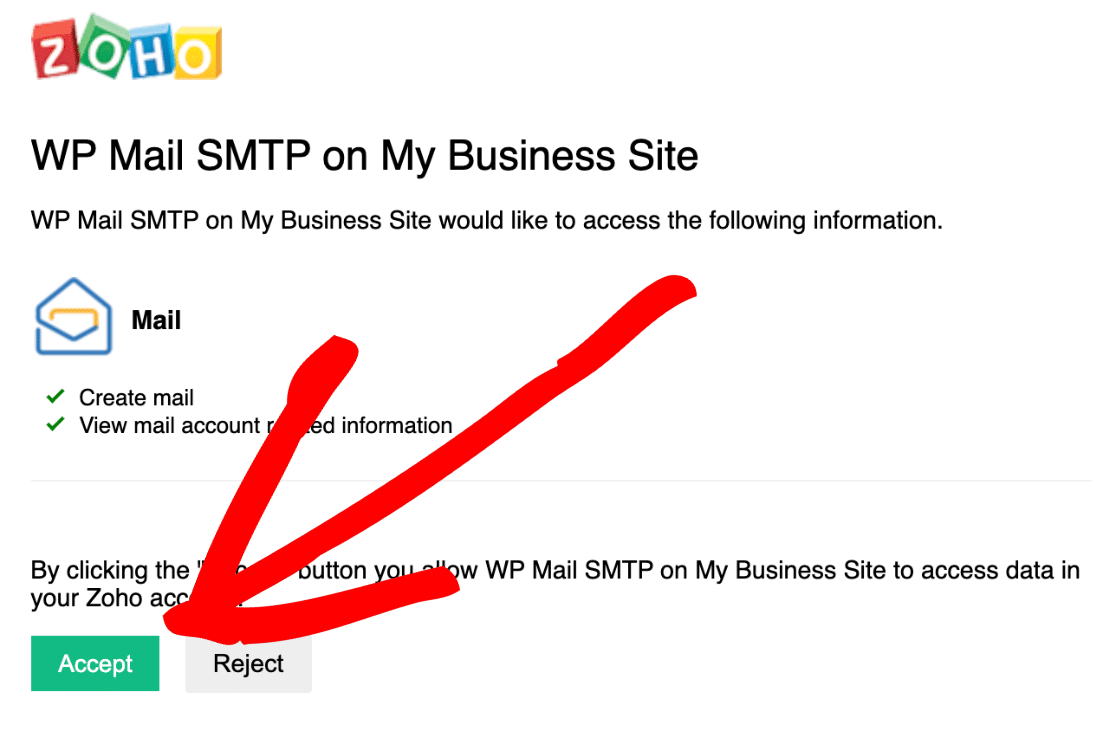 Uf. ¡Ya casi hemos terminado! En WP Mail SMTP, desplácese hasta la parte inferior y haga clic en Permitir que el complemento envíe correos electrónicos con su cuenta de Zoho Mail .