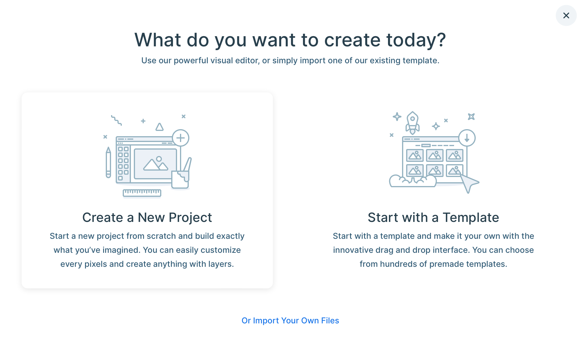 Aparecerá una ventana emergente donde podrá elegir continuar de tres maneras. Puede seleccionar una plantilla prefabricada, importar sus propios archivos o hacer clic en Crear un nuevo proyecto para diseñar un carrusel de imágenes desde cero.