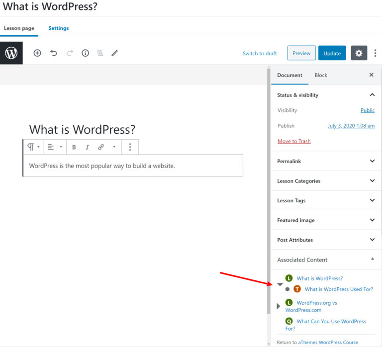 Al igual que LearnDash, puede usar el editor de bloques regular donde también obtendrá un cuadro que le muestra dónde se encuentra en la estructura general de su curso: