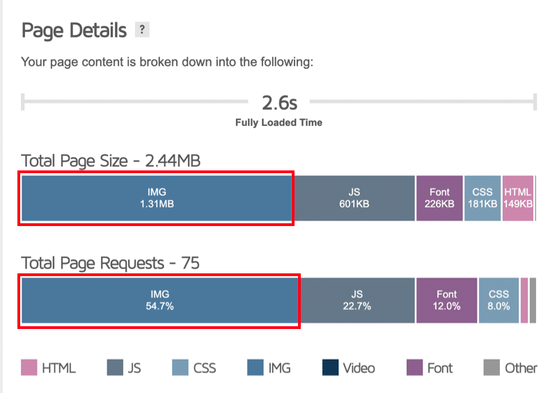 Además, las imágenes ocupan 1,31 MB de los 2,44 MB del tamaño total de mi página , el 54 % del tamaño total de la página. De 75 solicitudes, 41 son realizadas por las imágenes, constituyendo el 55% de las solicitudes.