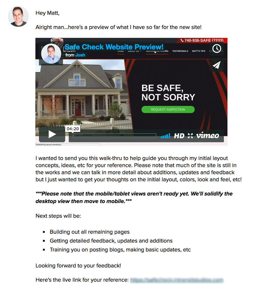Grabo mis videos de recorrido con Screenflow para Mac. Luego subo el video a mi canal de Vimeo y lo convierto en un video privado. A partir de ahí, como puede ver en la instantánea anterior, envío ese enlace de video al cliente junto con una breve descripción, una lista con viñetas de lo que puede esperar a continuación y la URL real del sitio de desarrollo para que el cliente vea en su navegador. después de ver el video.