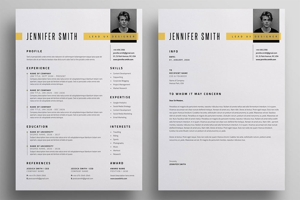 El currículum literalmente habla de sus calificaciones, logros y habilidades. Le da al empleador los antecedentes que tiene y ver si se ajusta a sus necesidades. Por lo tanto, es mejor planificar bien el contenido de su currículum, incluidas las habilidades y la capacitación, la experiencia laboral y la educación y, lo más importante, los logros que ha logrado con empleadores anteriores. Aquí hay una maqueta PSD de currículum gratuito que es ideal para sus proyectos de currículum. Específicamente, esta maqueta ofrece dos archivos PSD: uno usa un amarillo como color principal y el otro verde. Cada uno de estos tiene gráficos de resolución con una dimensión de 2551 × 3579 píxeles.