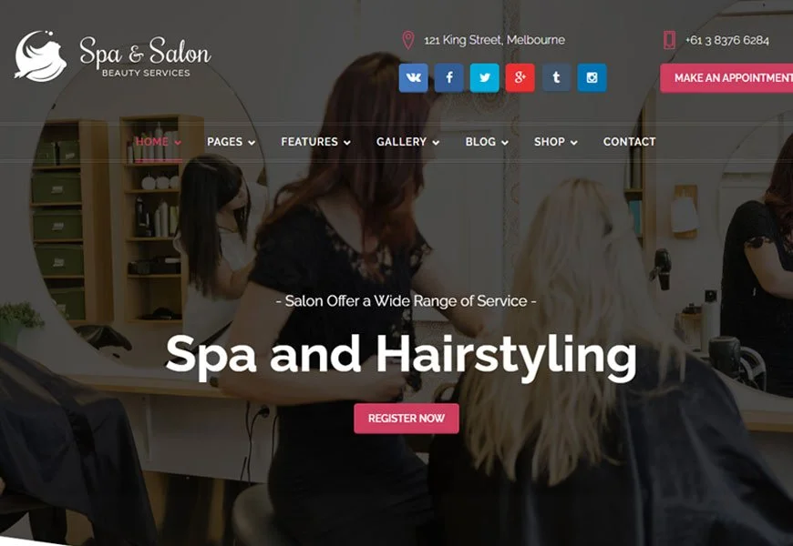 Salox capitaliza la afinidad humana natural con el arte y la belleza con sus elementos. Ofrece 3 diseños de página de inicio únicos que se adaptarán a cualquier tipo de salón en cualquier lugar. Puede mezclar y combinar elementos de las demostraciones disponibles para obtener el mejor aspecto. Los diseños de listas de servicios también se destacan y tienen muchas variaciones. Tiene 3 opciones para los estilos de menú principales, todos los cuales son excepcionalmente hermosos. Salox hace posible que sus actualizaciones sean visibles en Instagram a través de una transmisión en vivo intuitiva.