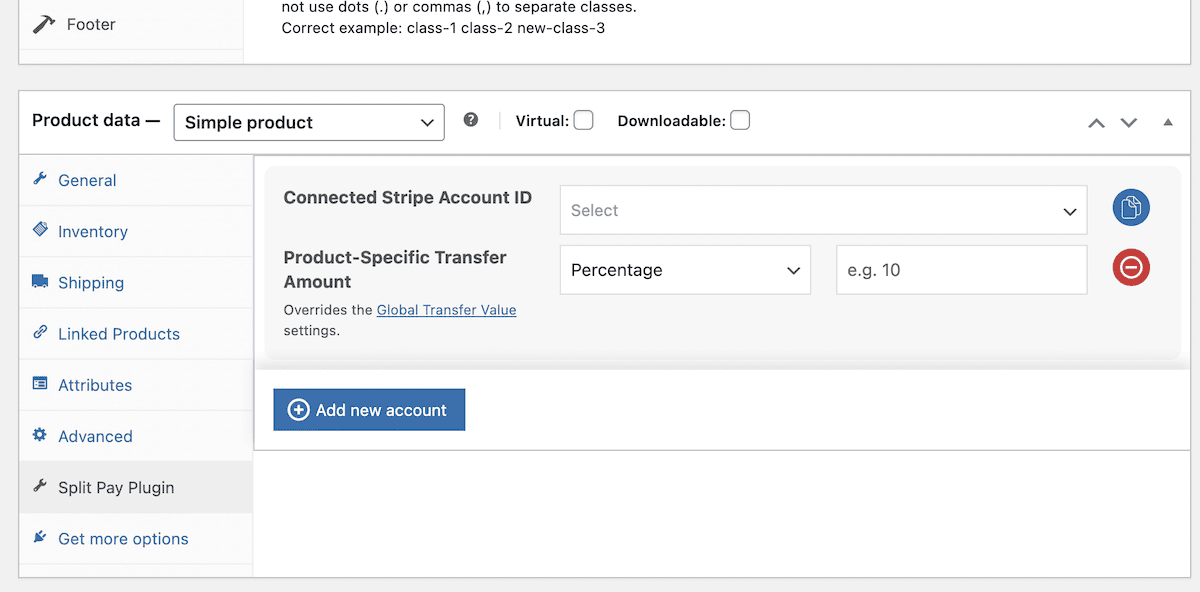 En la versión gratuita del complemento, solo puedes transferir un porcentaje global de las ventas a Stripe. En la versión premium, también tienes la opción de enviar cantidades fijas. Además, puedes transferir las tarifas de envío y configurar dividendos específicos del producto también.