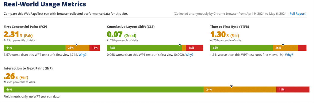 La tercera sección en la que debes centrarte es en las métricas de uso en el mundo real. Esta sección en particular muestra un resumen de las mismas métricas, es decir, CLS, FCP, LCP, TTFP e INP en comparación con los datos de rendimiento recopilados por el navegador de otros usuarios.