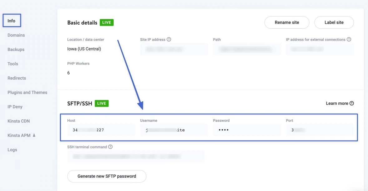Cada sitio alojado en Kinsta tiene una sección de Información. Y dentro de esa sección puede encontrar un título para SFTP/SSH, que enumera el host, el nombre de usuario, la contraseña y el puerto necesarios para conectarse a través de FTP.