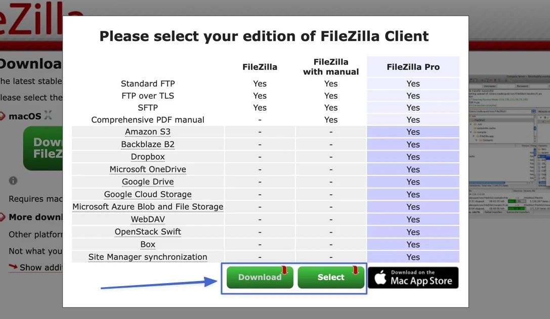 Haga clic en el botón Descargar para la opción FileZilla o FileZilla con manual. No es necesario tener el manual, pero puede resultar útil en el futuro.