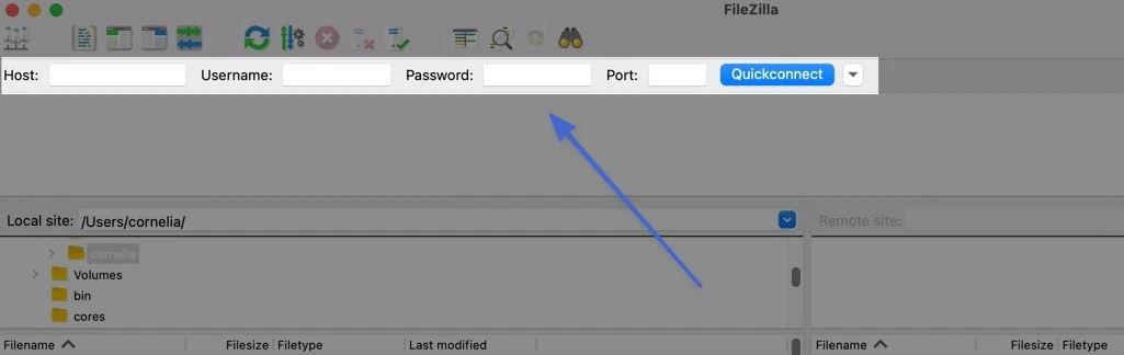 Una vez que tenga sus credenciales, existe la opción de copiarlas y pegarlas en FileZilla y hacer clic en el botón Conexión rápida.