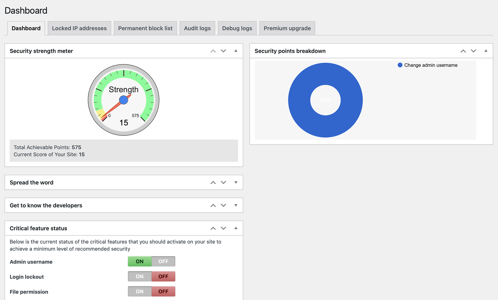 Al igual que Wordfence, el panel proporciona una breve descripción general de la seguridad de su sitio, incluido un medidor de fuerza y botones rápidos de encendido/apagado para funciones críticas. Para mejorar su puntuación de seguridad, deberá habilitar cada una de estas configuraciones.
