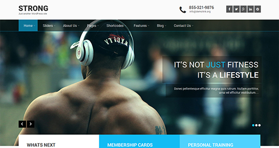En toda esta colección de las mejores plantillas móviles de WordPress, una de las opciones más populares es Strong Pro. Esta es una puerta de entrada ideal para cualquiera que esté considerando desarrollar un sitio web basado en fitness.