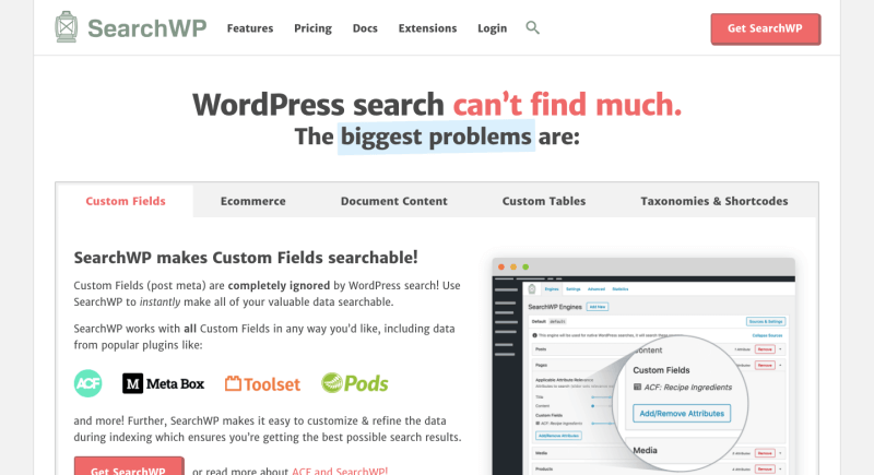 Search WP siempre es mi primera opción cuando se trata de instalar complementos de búsqueda de WordPress. Es una solución todo en uno para proporcionar la mejor experiencia de usuario. Lo que distingue a Search WP es su capacidad para profundizar en el contenido de su sitio web, incluidos los campos personalizados y los tipos de publicaciones personalizadas.