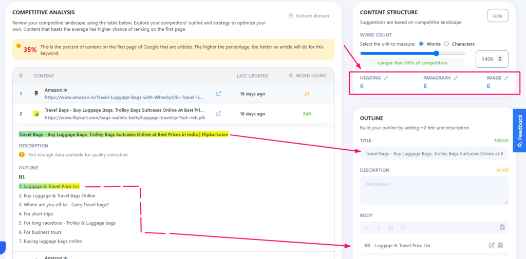 En el paso 1 , esta herramienta te ayuda a crear un esquema para tu artículo. Sugiere encabezados utilizados por las páginas mejor clasificadas e información con preguntas. Puede configurar el recuento de palabras de su artículo y le sugiere la cantidad de encabezados e imágenes a usar.