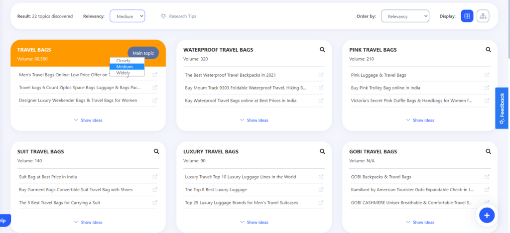 Elegir un tema para su blog/artículo puede llevar mucho tiempo. E investigar la idea que se te ocurrió puede llevar mucho trabajo y tiempo. Topic Discovery hace todo esto en minutos, ayudándolo con las palabras clave y los temas relevantes para su nuevo artículo.