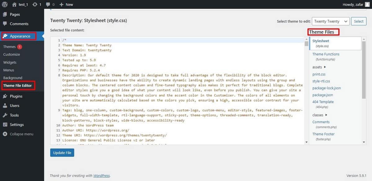 Dans la première étape, accédez à Apparence > Éditeur de fichier de thème .