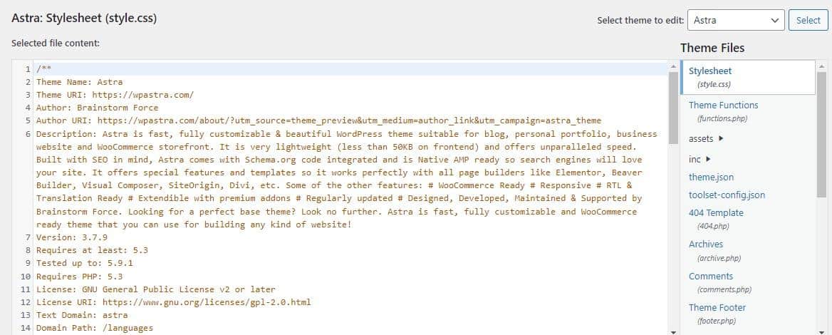 Cela ouvre la section Modifier les thèmes . Généralement, style.css, la feuille de style par défaut, est ouverte dans l'éditeur.