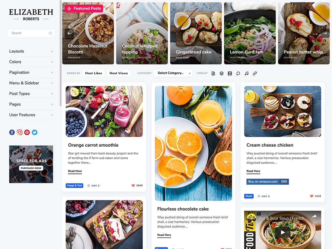 La démo principale du package thématique Pluto a été configurée pour afficher les recettes qui ont été ajoutées par le propriétaire du site Web, ainsi que d'autres contenus liés à l'alimentation soumis par les utilisateurs. Il existe un certain nombre de mises en page différentes disponibles qui peuvent être appliquées à l'avant de votre site Web, vous donnant accès à des options telles qu'une mise en page en maçonnerie, une option de style Pinterest et une mise en page qui affiche une liste de publications en mode pleine largeur.