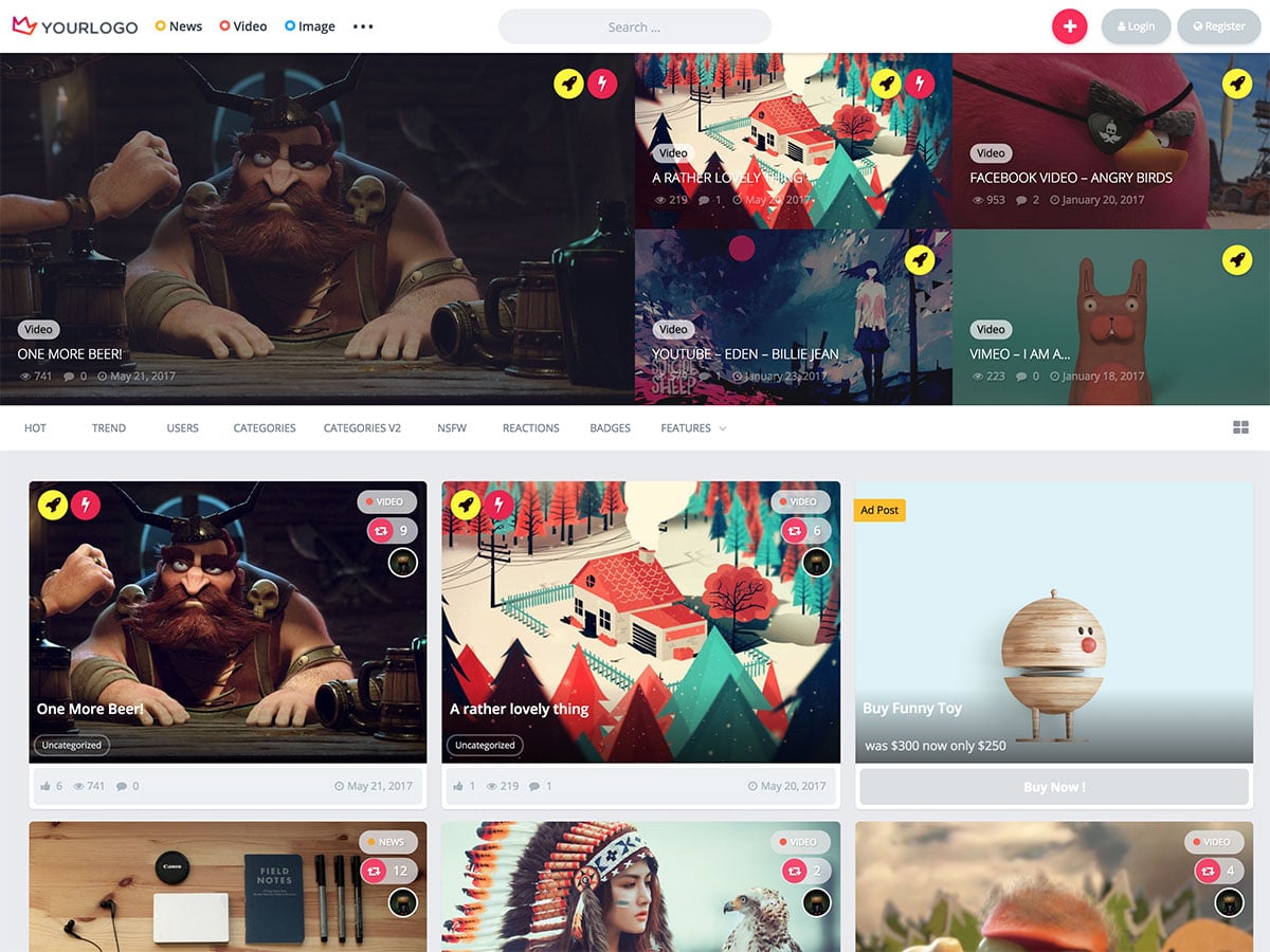 Ces fonctionnalités incluent des formulaires d'inscription et de soumission de contenu faciles à utiliser, des profils d'utilisateurs, une recherche en direct et un système d'évaluation des utilisateurs pour rendre votre site Web encore plus interactif. La conception est entièrement mobile pour répondre aux besoins des utilisateurs de smartphones et de tablettes, et il existe de nombreuses options de monétisation à utiliser si vous souhaitez générer un revenu à partir de votre site Web de partage de contenu.