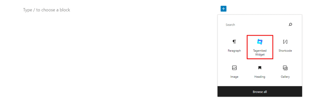 Lorsque vous êtes prêt à ajouter votre flux, vous pouvez copier le shortcode, accéder à votre page ou publication, cliquer sur l'icône +, choisir le widget Tagembed, coller le shortcode et cliquer sur Embed.