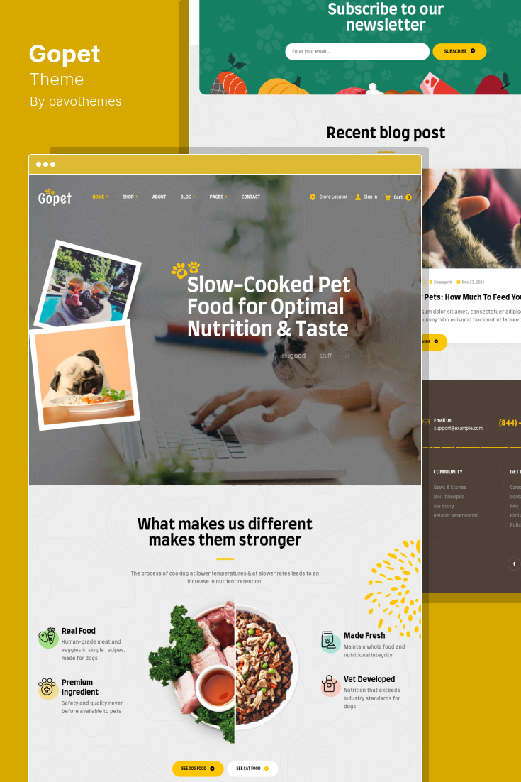 Gopet est un thème WordPress pour aliments pour animaux de compagnie conçu spécifiquement pour les sites Web d'animaux, de blogs, d'entreprises et de magasins.