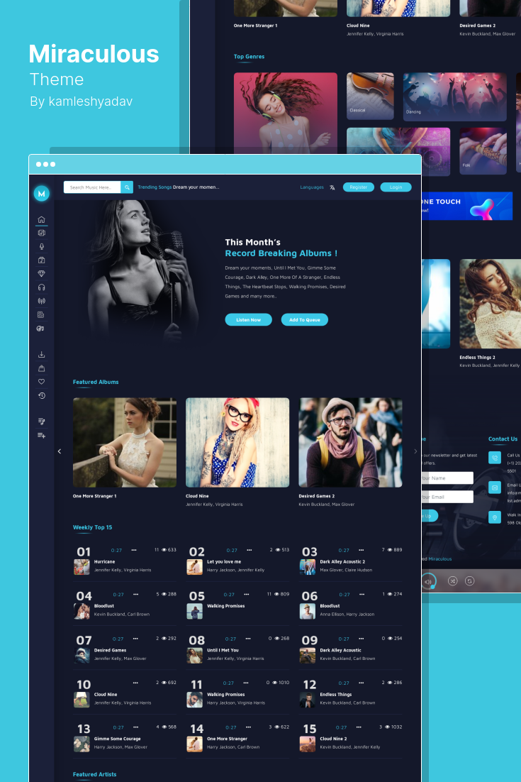 Dans ce thème de studio d'enregistrement, vous pouvez créer de nombreuses listes de lecture et vos clients peuvent mettre en file d'attente les chansons comme ils le souhaitent. Il vous permet également de modifier la qualité des chansons, donc s'ils le souhaitent, ils peuvent choisir le niveau de qualité qu'ils désirent.