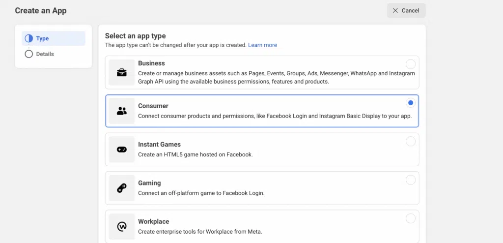Sélectionnez Créer une application et vous serez redirigé vers un nouvel écran. Ici, choisissez Consumer puis appuyez sur Next :