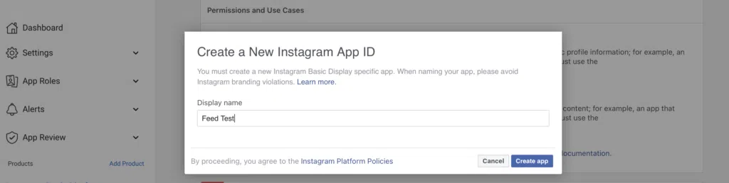 C'est une bonne idée de visiter le lien fourni dans la fenêtre contextuelle pour éviter les violations de la marque Instagram. Ensuite, dans la zone Nom d'affichage , entrez un nouvel ID d'application Instagram et appuyez sur Créer une application .