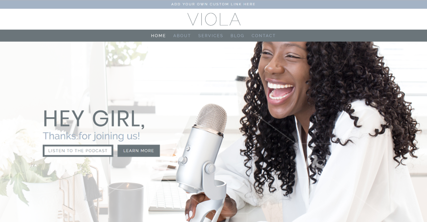 The Viola comprend cinq pages principales et se concentre sur le podcast. La page d'accueil affiche une image en plein écran pour la section des héros et un CTA pour répertorier le podcast et en savoir plus à ce sujet. Un abonnement par e-mail suit cela, puis vous verrez une section À propos avec des informations sur le podcast avec un bouton pour en voir plus. Les compteurs numériques indiquent le nombre d'épisodes et d'auditeurs. Vous devrez créer vous-même la page de podcast, mais cela peut être fait avec la page de blog, qui a un fond gris avec une disposition en grille. Alternativement, les boutons de podcast peuvent emmener le visiteur vers l'endroit où le podcast est hébergé.