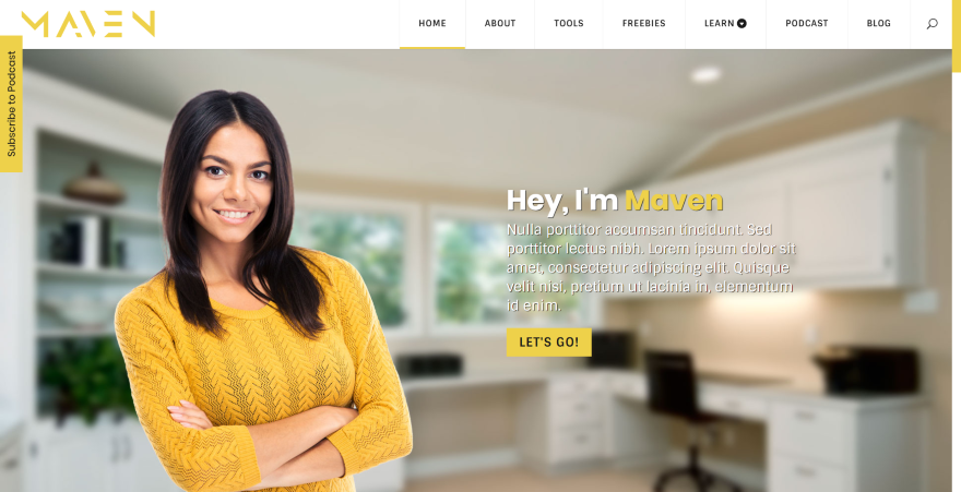 Maven est livré avec 10 pages principales et comprend plusieurs pages de vente, des pages de confirmation d'abonnement, des formulaires Bloom personnalisés, un bouton d'abonnement persistant et l'intégration Blubrry PowerPress. La page d'accueil affiche une section pour les podcasts avec une barre de son animée. La page du podcast affiche une barre de son animée similaire dans la section héros avec un lecteur audio personnalisé suivi de publications de podcast. Cliquer sur l'un ouvre la page du podcast avec un lecteur audio et une zone pour les notes de l'émission. Une barre latérale personnalisée affiche des informations sur l'épisode et inclut les liens abordés dans l'épisode. La page comprend également la navigation précédente/suivante et des liens vers des épisodes similaires.