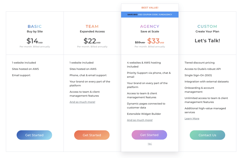 Duda propose quatre niveaux de tarification : de base, d'équipe, d'agence et personnalisé. Ces forfaits vont de 14 $ à 44 $ par mois (facturation annuelle). Le plan personnalisé, cependant, est destiné aux agences ou aux entreprises avec des centaines de sites Web.