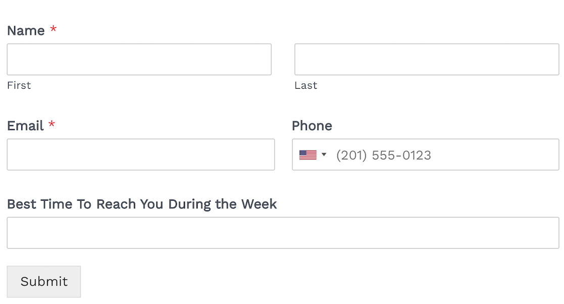 Voici un exemple de formulaire que nous avons créé à l'aide du champ Dispositions. La première ligne comprend un seul champ avec deux conteneurs d'entrée pour les zones de prénom et de nom. La deuxième ligne est composée de deux colonnes. La troisième ligne est à nouveau une seule colonne.